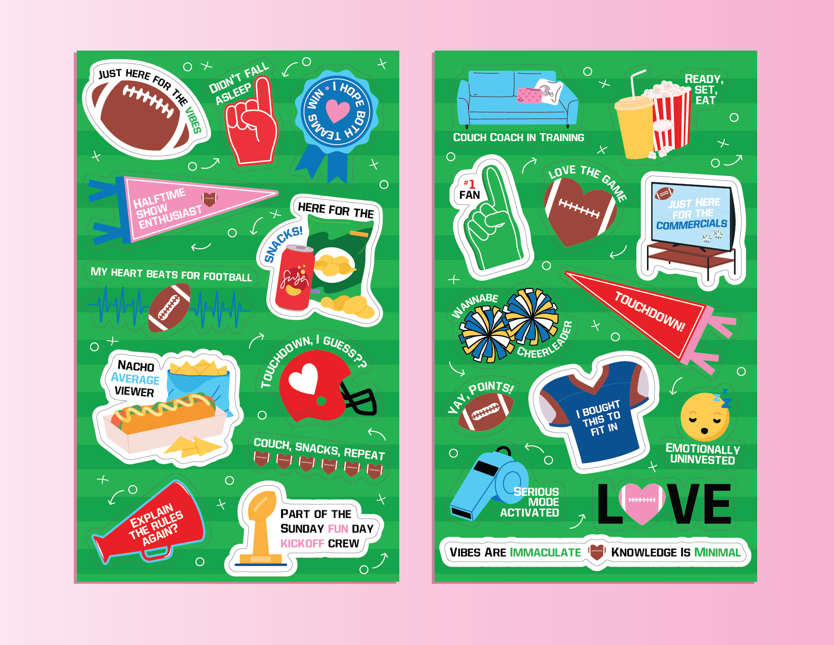 Shown here are the Superlative Stickers. I worked on these from initial concept through final execution. As someone unfamiliar with American football, this project presented an exciting creative challenge and pushed me to explore an unfamiliar subject matter.