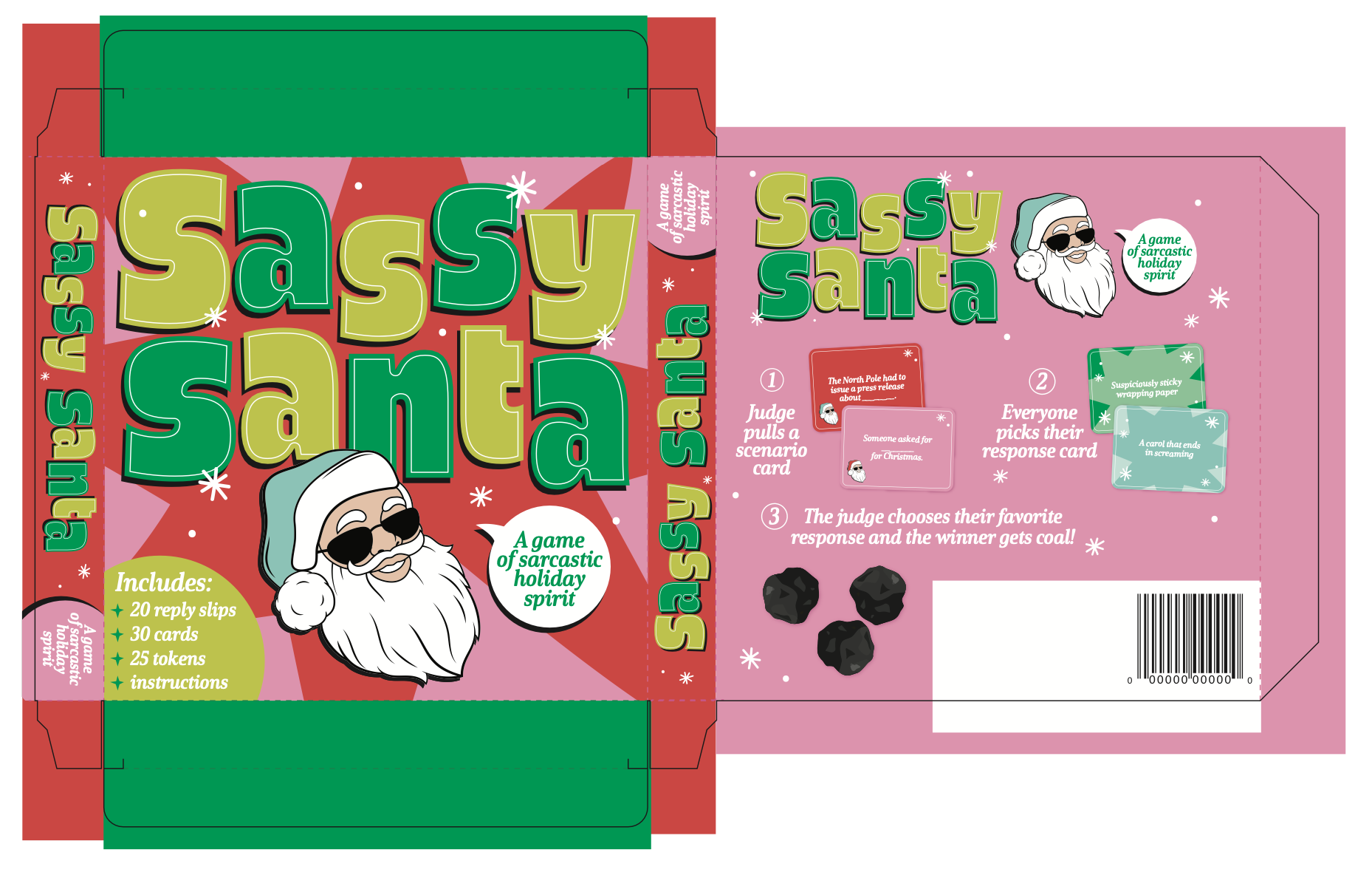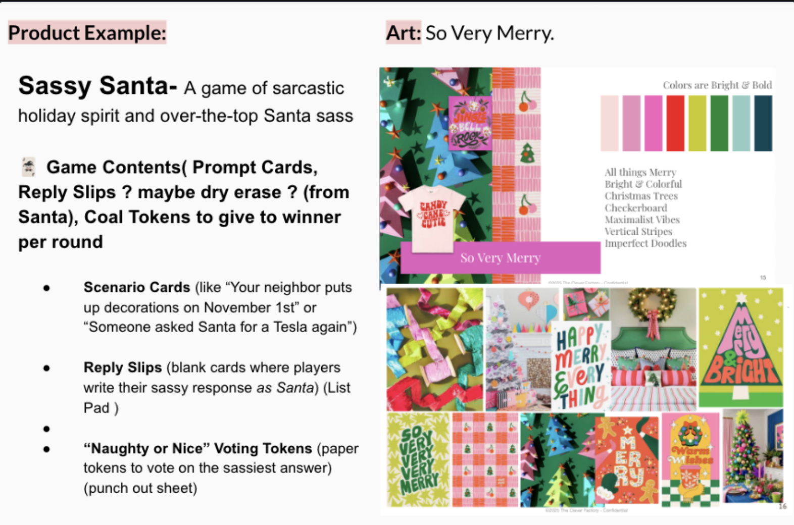 When I have extra time, I enjoy supporting other teams to broaden my skillset. The Impulse team needed help designing a Sassy Santa game, and I was excited to jump in and take on this project. You can see logo, designed cards, and coal on the left.